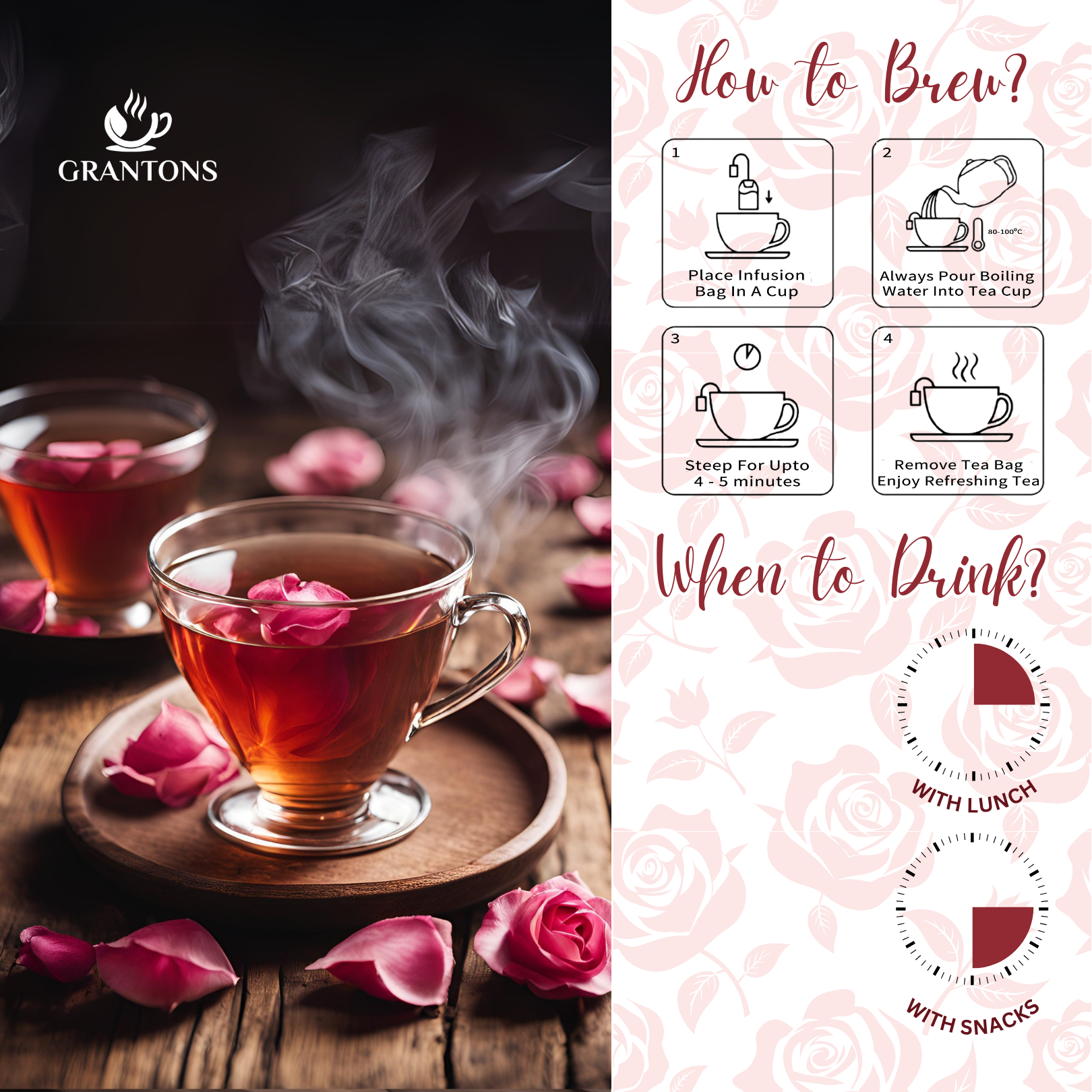 Tea Preparation: Add 1 teaspoon of rose petals to hot water. Let it steep for 5–7 minutes, strain, and sip.